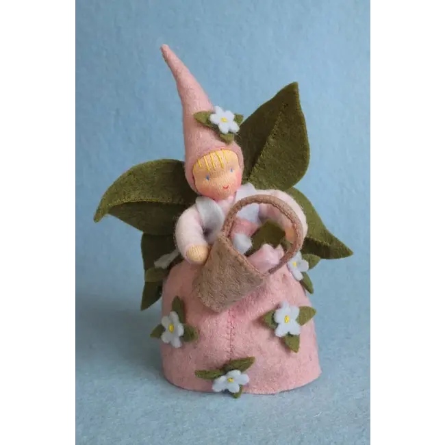 De rok van de fee is gemaakt van fresco vilt met vezels. Haar vleugels zijn vier bladeren. In haar hand houdt ze een mandje met lapjes stof vast. Ze is 16 cm hoog en komt de lente brengen.