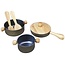 Mooie houten pannenset met spatels voor kleine keukenprinsen en -prinsessen. Past heel goed in je houten speelkeuken! De pannetjes zijn gemaakt van metaal en hout. De set bestaat uit 2 houten spatels, 3 pannen en een houten deksel (de deksel past op de koekenpan en de grootste pan)