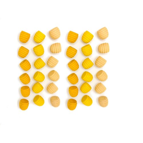 Set van 36 houten bijenkorfjes, in 3 verschillende tinten geel. Leuk voor tellen...
